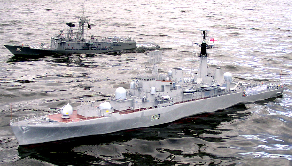H.M.S. Bristol the only one built from a projected class of six. Seen here in rough weather with the USS Gallery.
